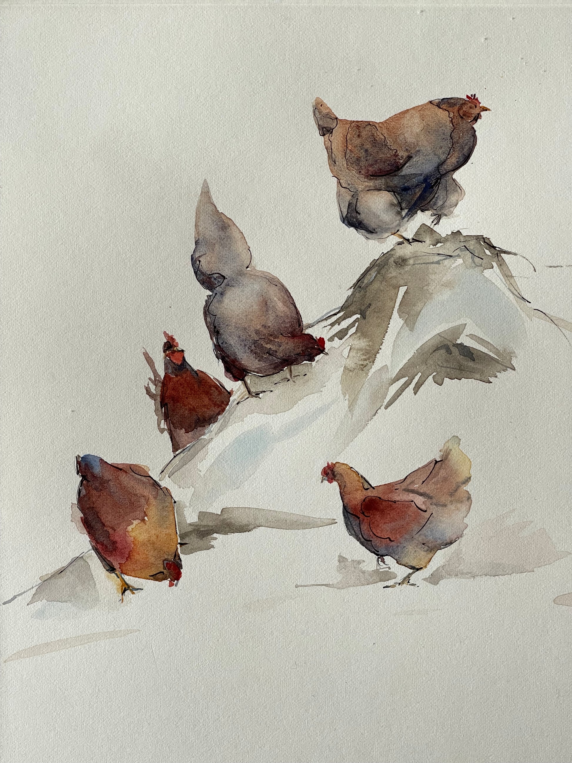 This watercolour illustration transforms a simple farmyard moment into a light-hearted scene full of character and charm. At the heart of the painting, one confident hen stands proudly on top of a small manure pile — a humorous “throne” that elevates her above the rest. Below, the other chickens wander and forage, seemingly accepting her playful sense of authority.