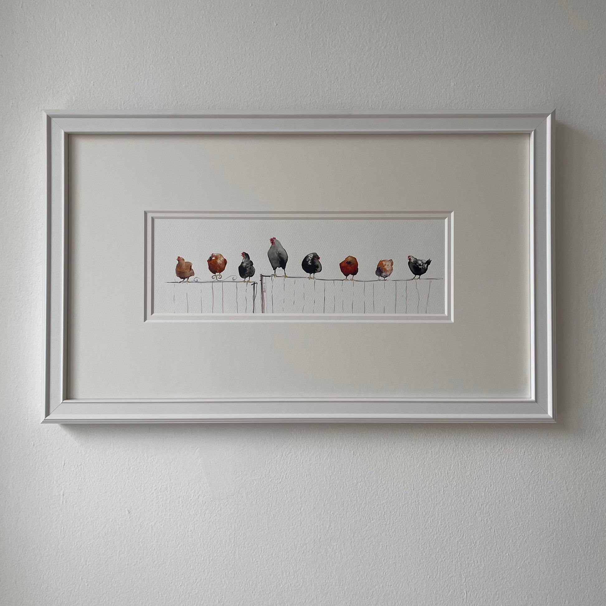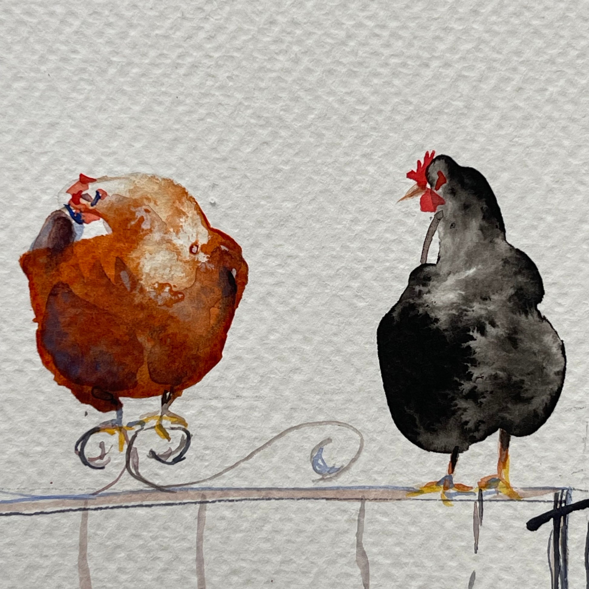 This artwork depicts a lively group of chickens perched along a fence, created with a mix of ink and watercolour. I was especially inspired by the effect of salt on ink — a technique that brings a soft, organic texture reminiscent of real feathers. The simplicity of the composition reflects the sincerity and unpolished charm of rural life, while the bright colours introduce warmth, character, and a joyful spirit.