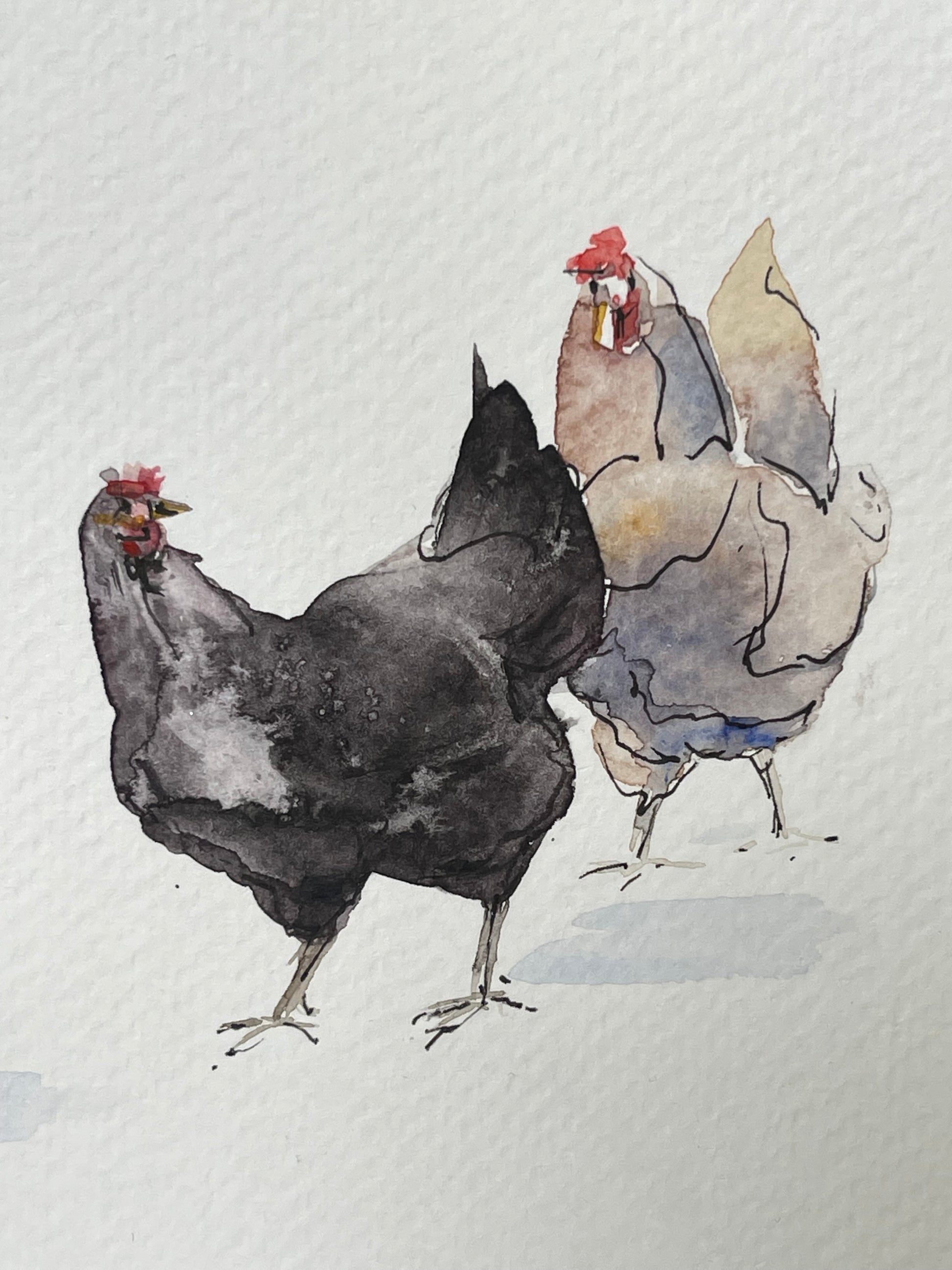 Chickens on Stage – Small Watercolour & Ink Originals Size: 5.5 × 7 inches.