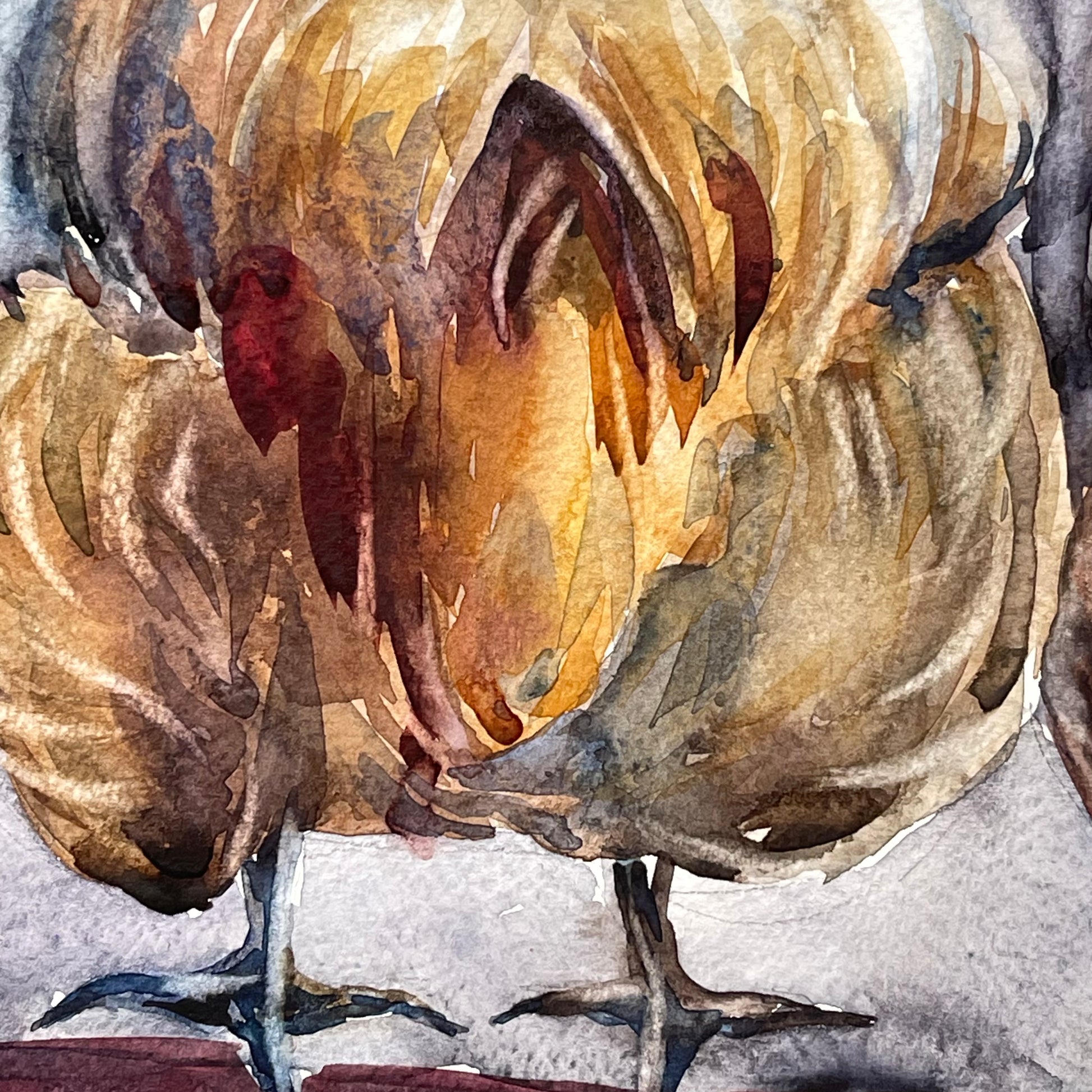 Chickens. Three Friends focuses on the charm and individuality of chickens, one of my favourite subjects to paint in watercolour. Their intricate feathers, subtle movements, and unique personalities make them an inspiring subject. Using soft, flowing washes, this piece captures both their form and gentle energy, inviting viewers to notice the quiet beauty and playful spirit of these familiar creatures.