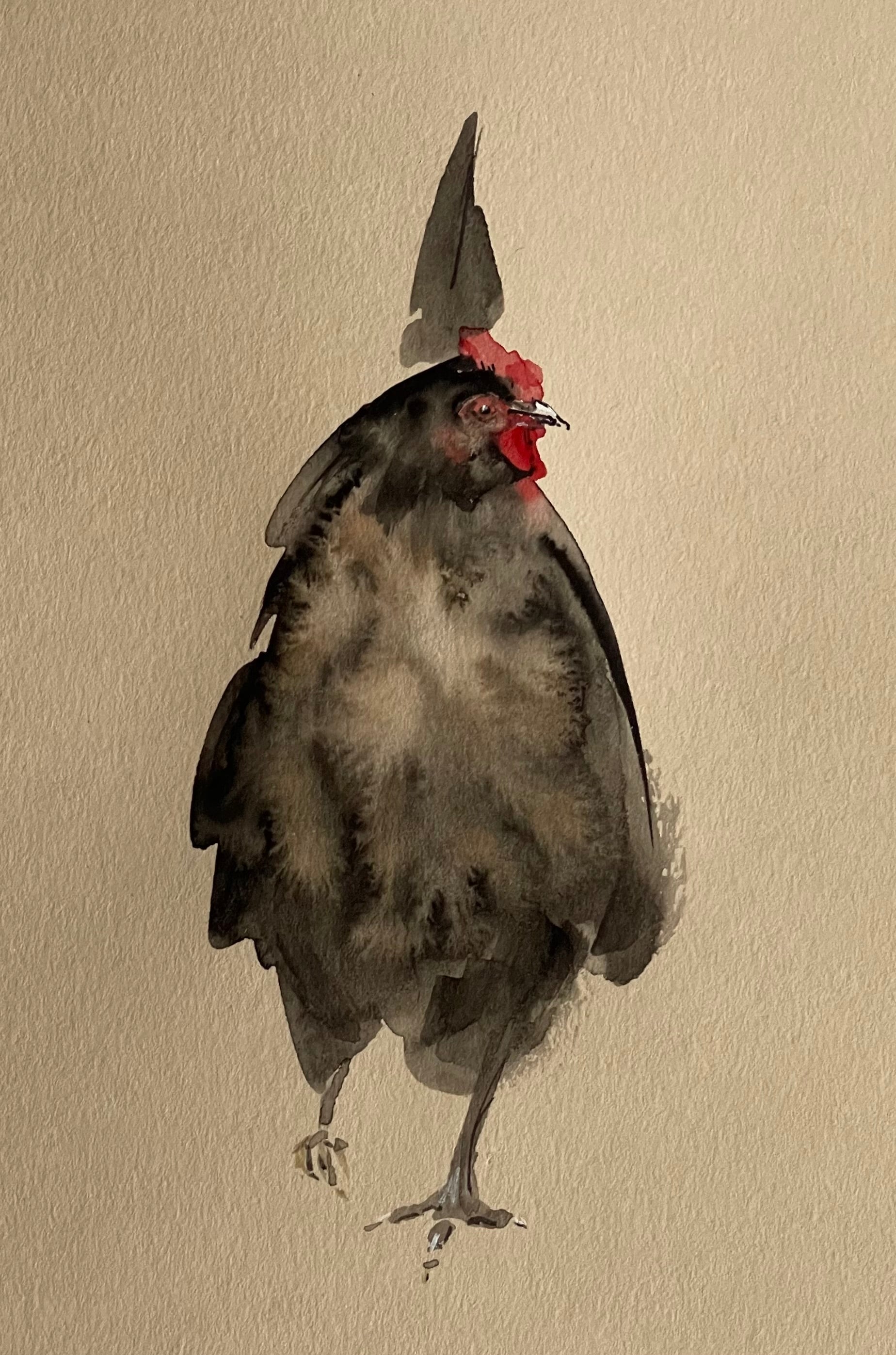 Creamy Chicken is a gentle watercolour study of a chicken, painted with soft, layered strokes and careful attention to texture. The process combined patience and intuition, allowing the colours to settle naturally and create a calm, tender mood.