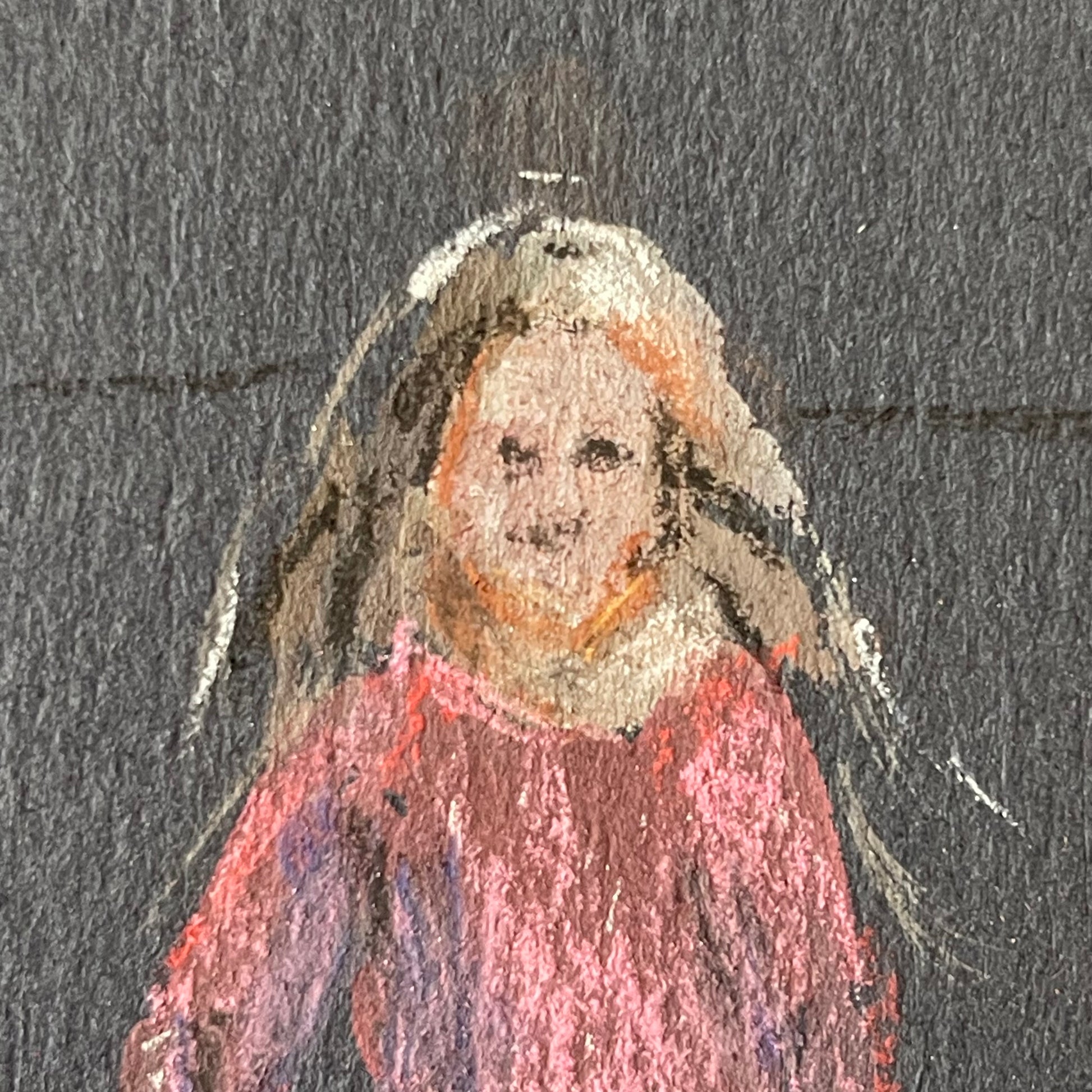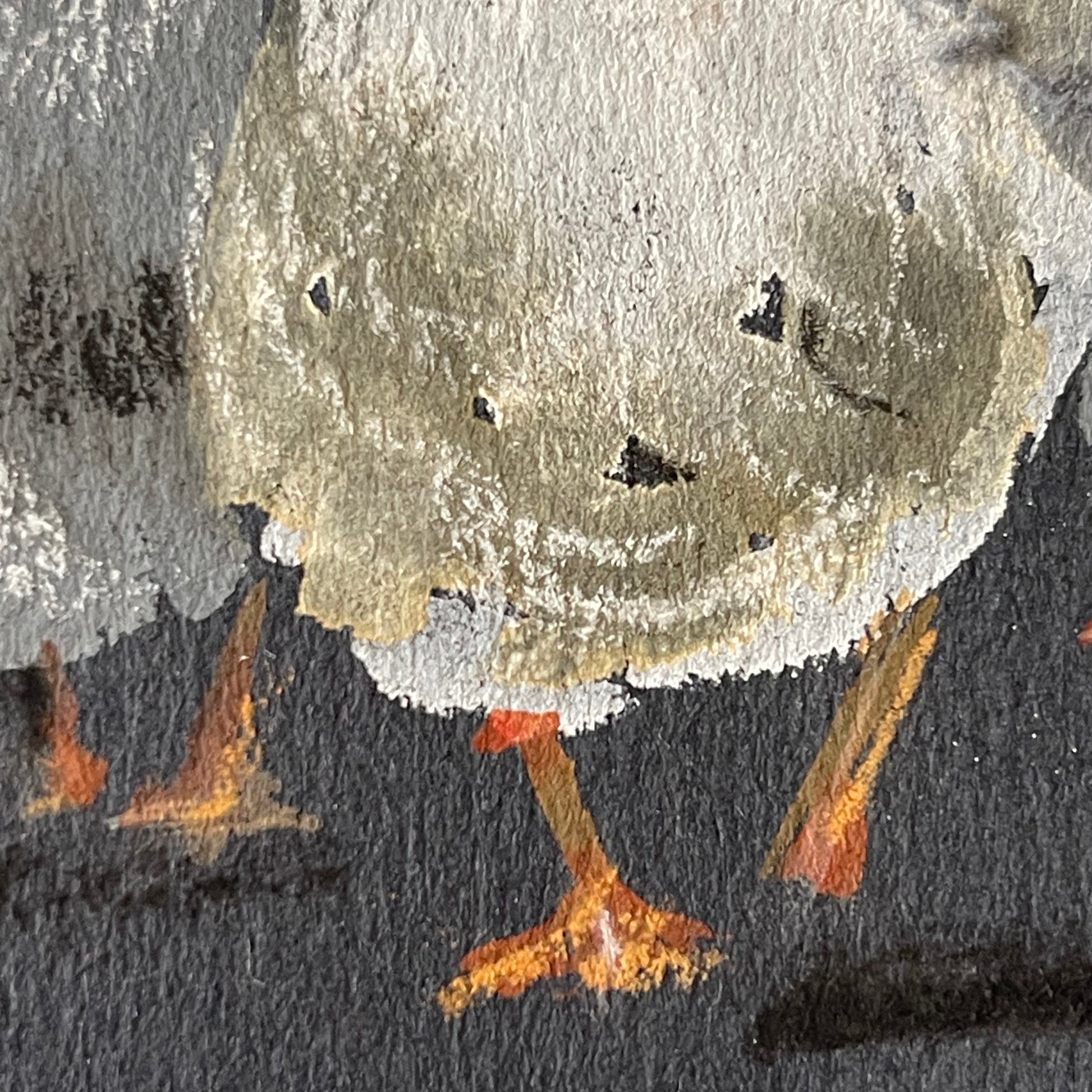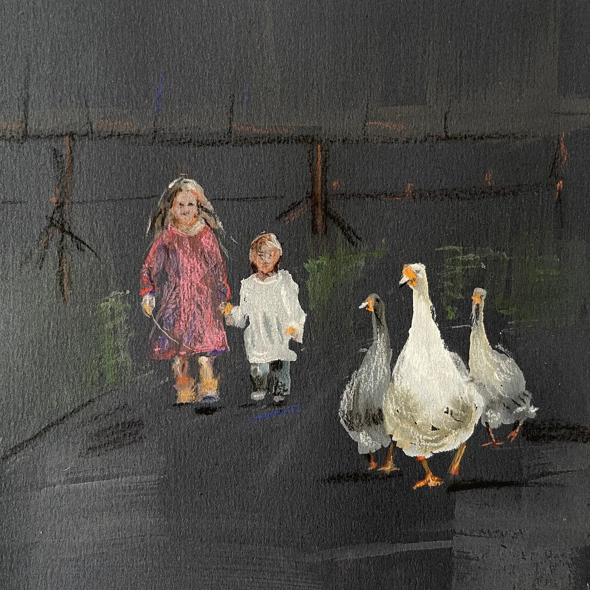 This painting depicts a sister and her younger brother guiding geese home as dusk settles around them. Soft pastel and watercolour washes capture the gentle light and tender moment, while the black paper emphasizes the encroaching evening and allows the subtle hues of the children and geese to stand out.