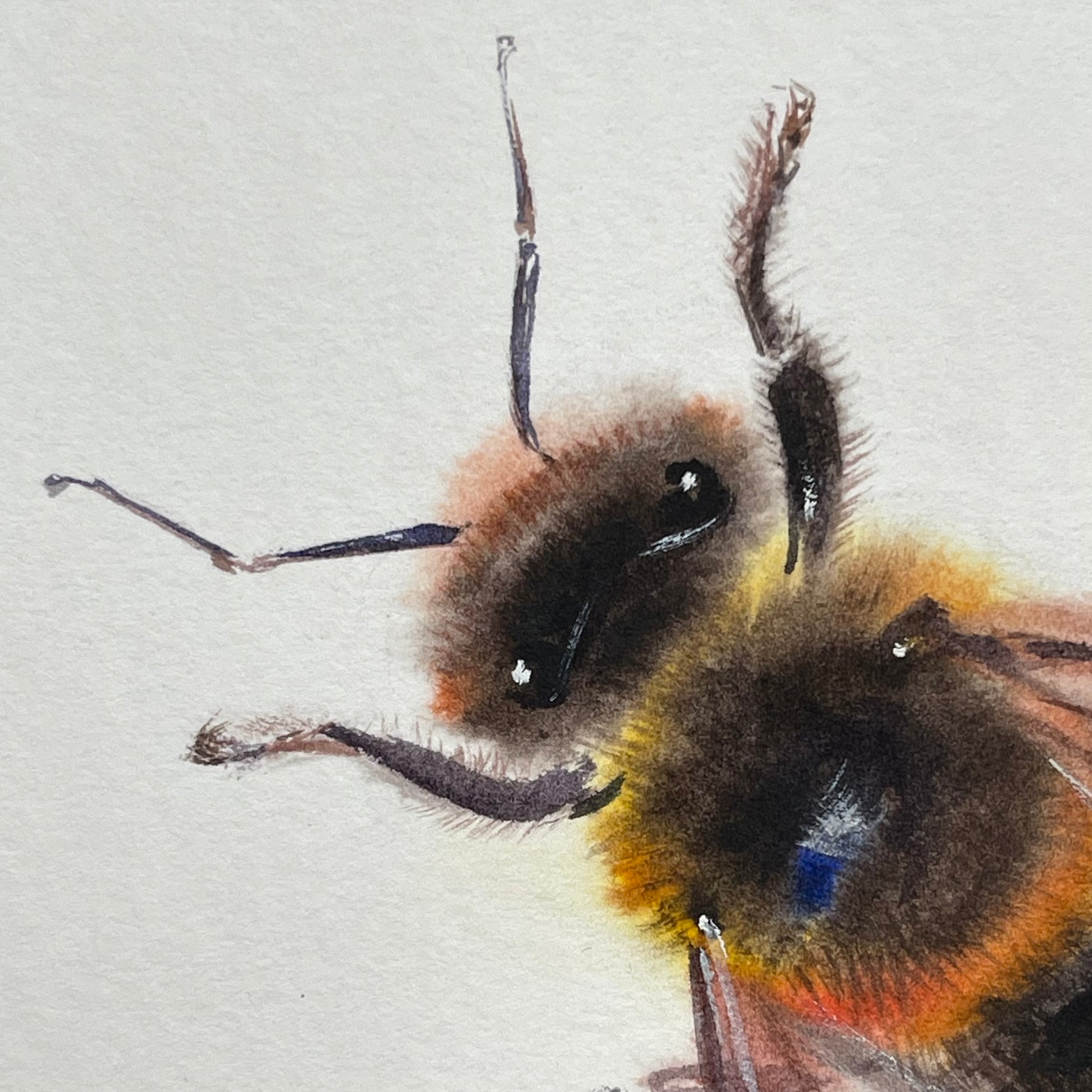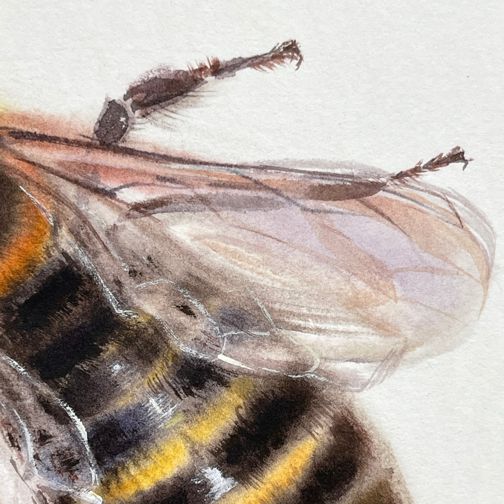 Once the paper dried, I added precise details with a white watercolour pencil to define the bee’s form — from the delicate wings to the soft texture of its body. This careful layering creates a sense of presence and stillness, as if the bee has paused for a moment before continuing its work.