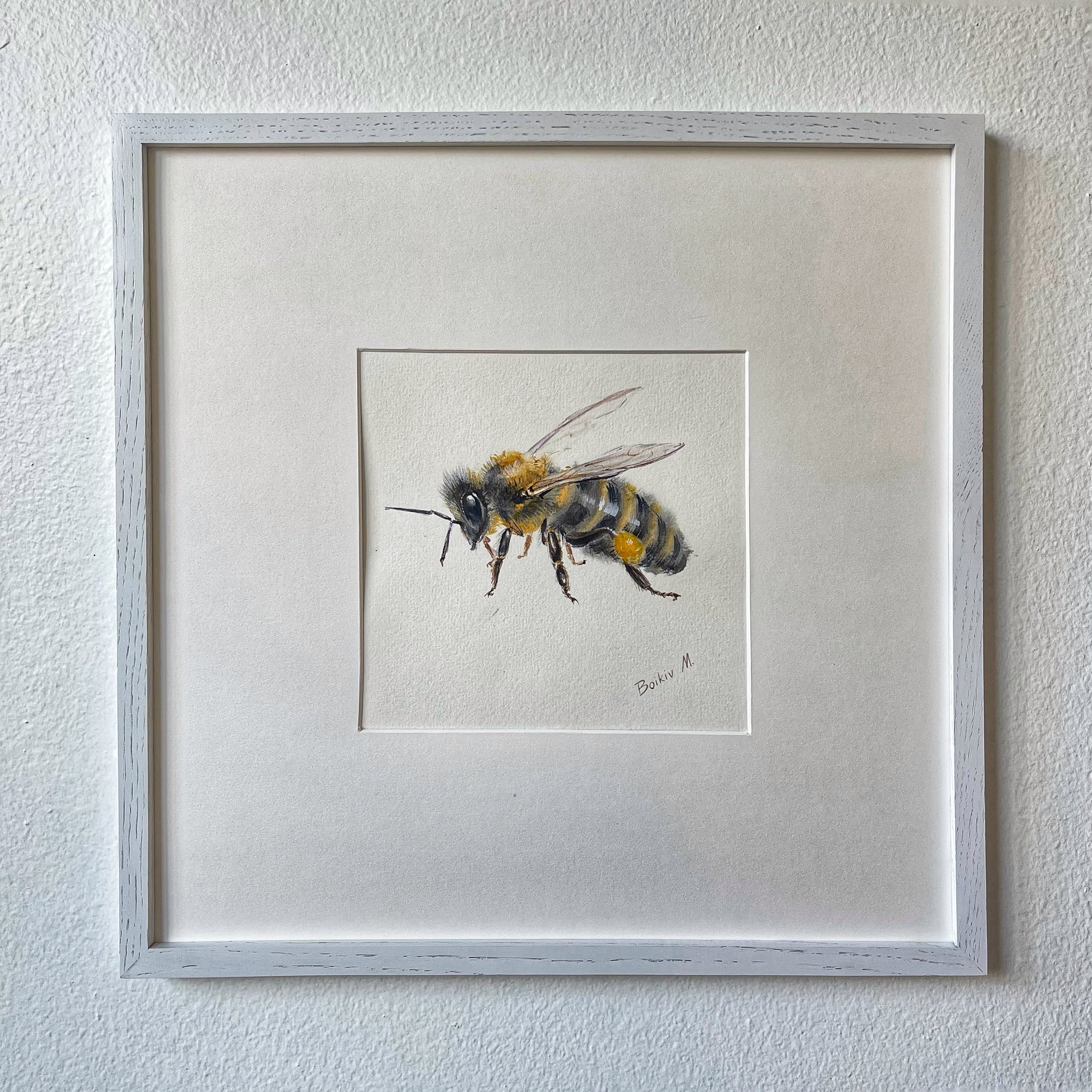 Honey Bee features a delicate honey bee with ethereal, transparent wings, capturing the fragile beauty of these essential pollinators. This artwork highlights the bee’s quiet grace and vital role in our ecosystem, serving as a gentle reminder to “Save the Bees.” The soft, luminous watercolour technique emphasizes the transparency and delicacy of the wings, inviting viewers to pause and appreciate the small but crucial creatures that sustain our natural world. The piece is presented framed in a wooden frame with a mat, ready for display.