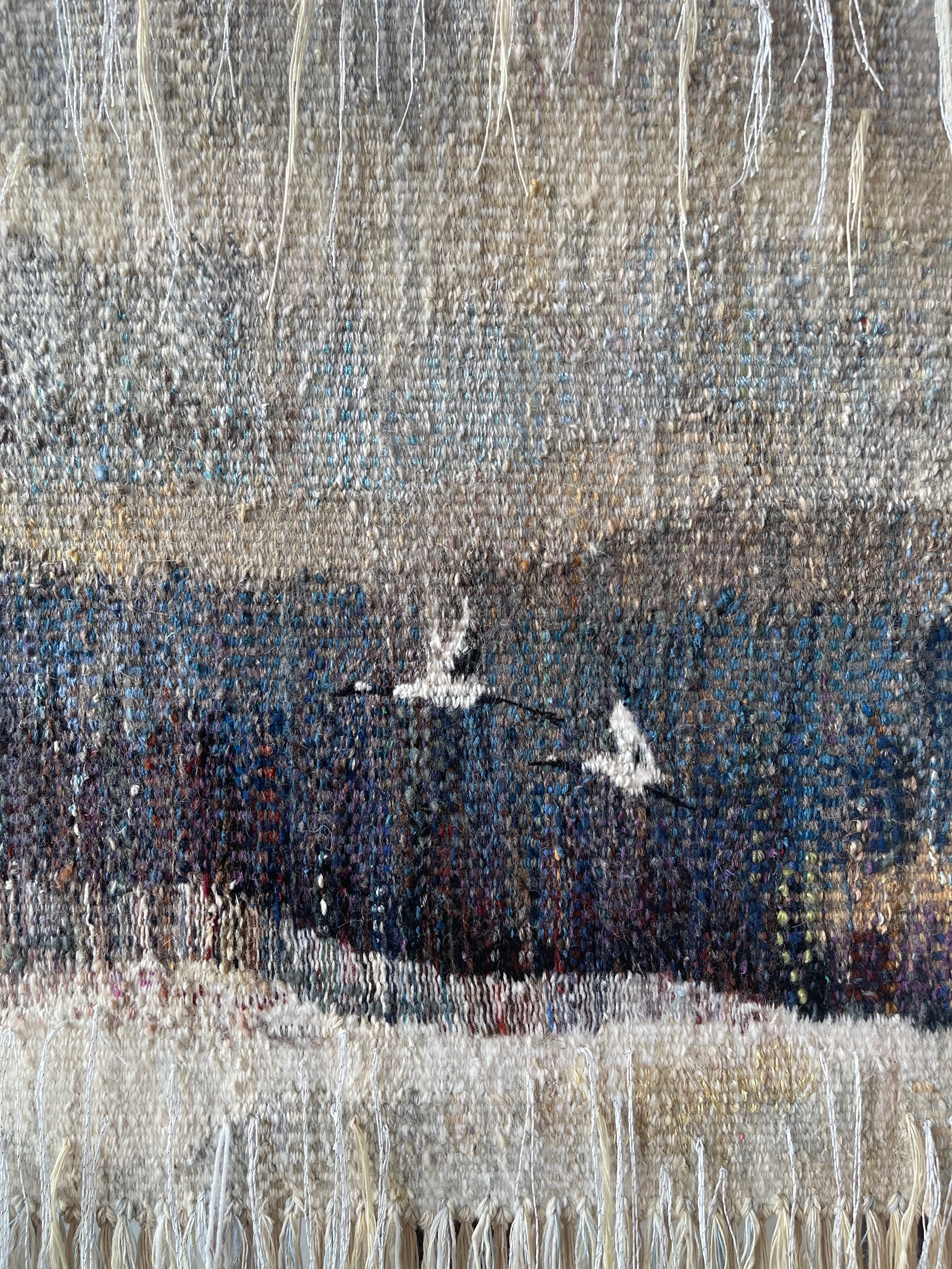 This tapestry began as a watercolour sketch painted in early spring, when snow still lingered but nature was awakening from winter. It was during this season that cranes return from distant lands, sometimes perishing in harsh conditions, underscoring their deep connection to their native land.
