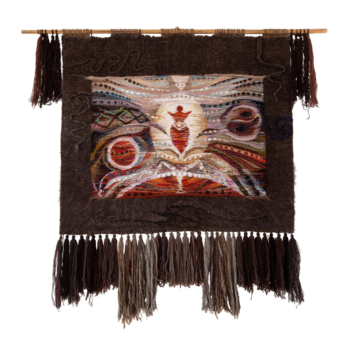 This tapestry is inspired by the Ukrainian Easter egg, or pysanka, and incorporates Trypillian motifs. Its central image depicts a Ukrainian Madonna figure, surrounded by symbolic elements of Yin and Yang, reflecting the pysanka’s themes of eternal renewal, life continuation, resurrection, and awakening. The composition is timeless and created as a collage, combining multiple weaving techniques and varied textures. The piece has been exhibited in Ukraine, Europe, and Canada, celebrating cultural heritage and contemporary textile practice.