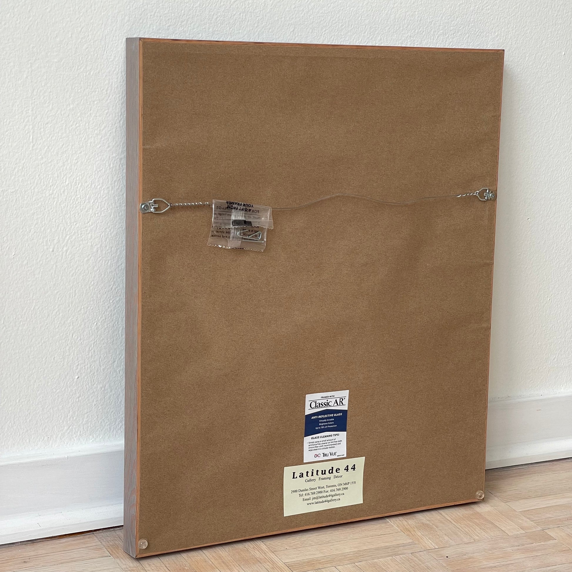 Framed in a wooden frame with double matting and museum glass, with a spaced mount to emphasize the paper’s texture.