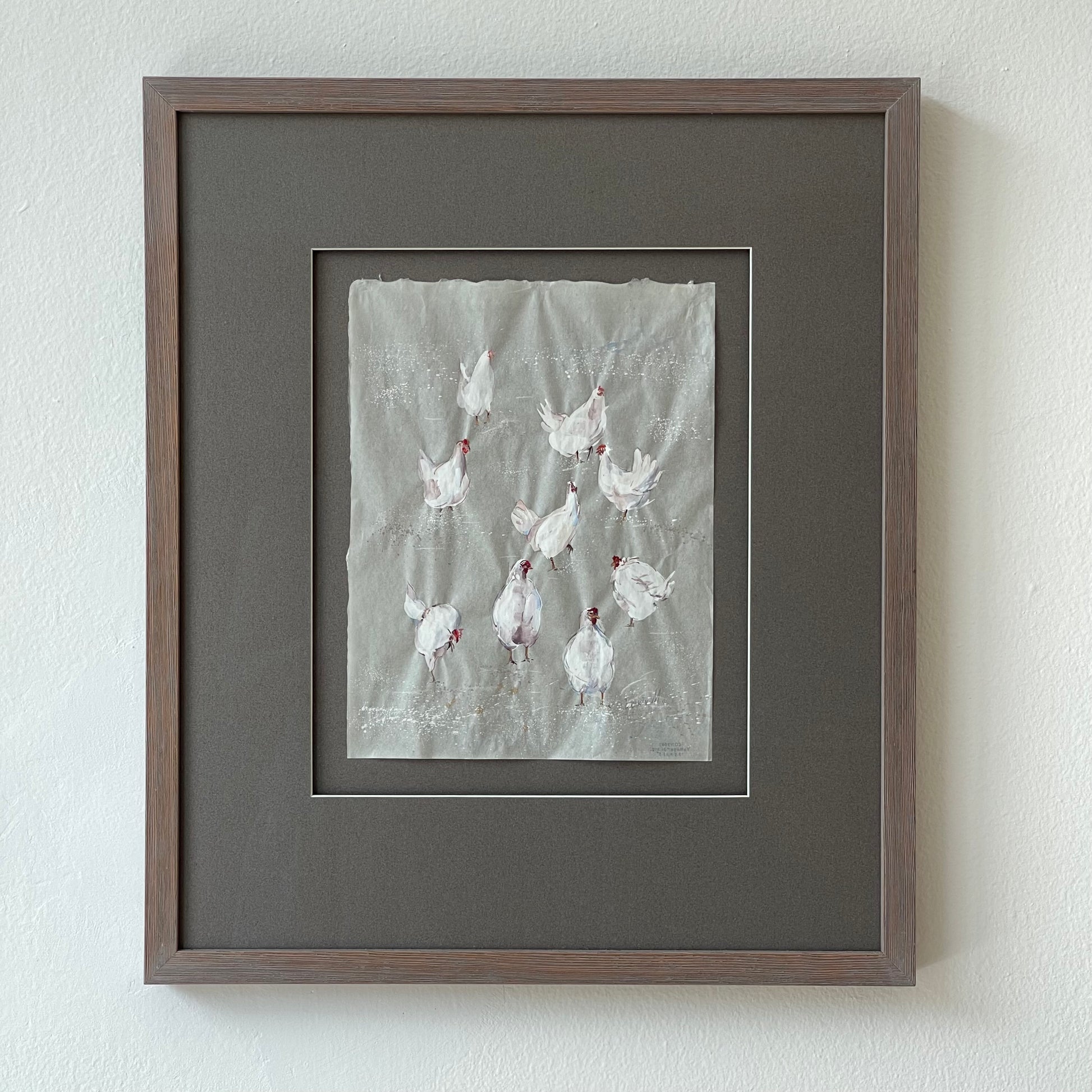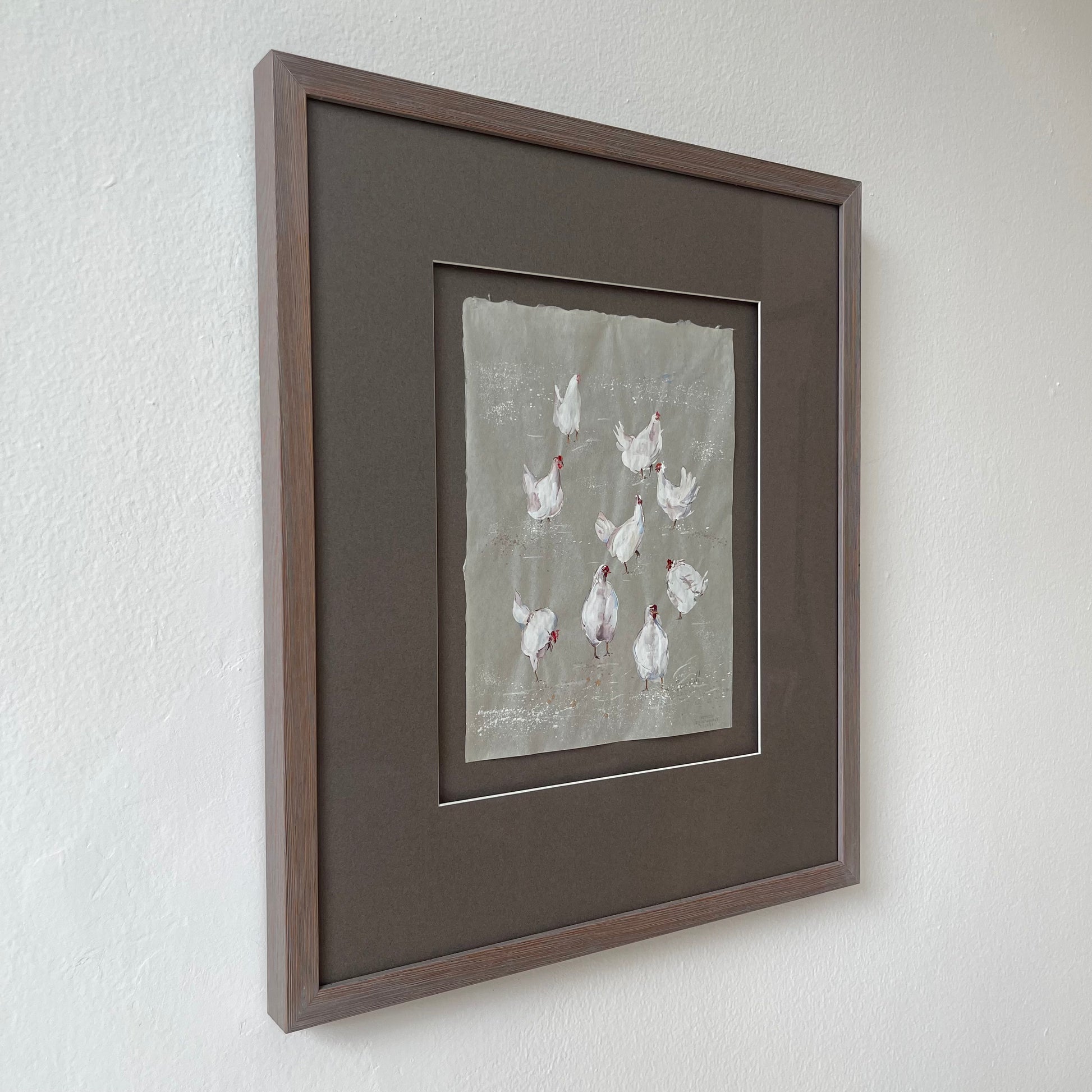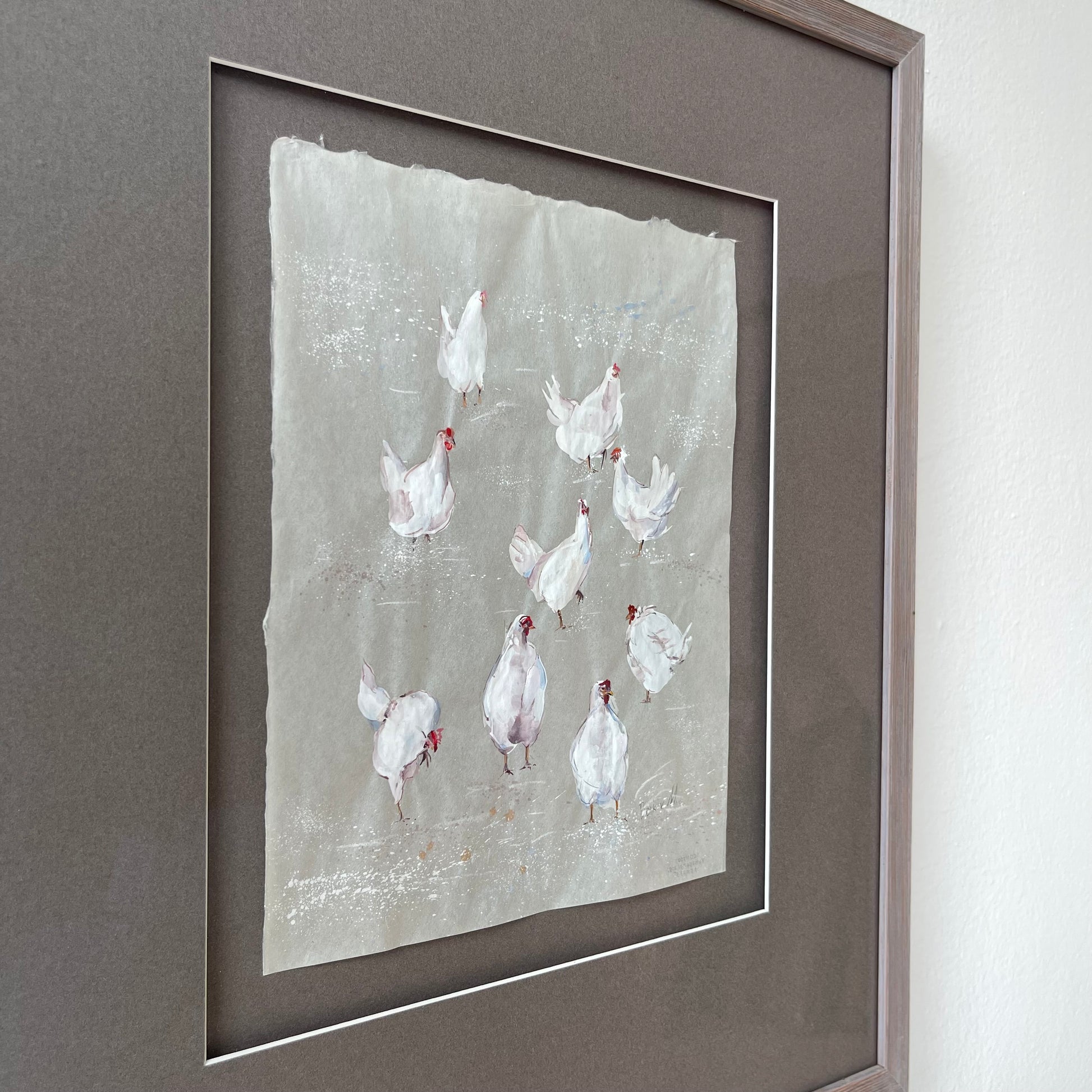 The white hens emerge softly from the pale surface, evoking airiness and quiet movement.